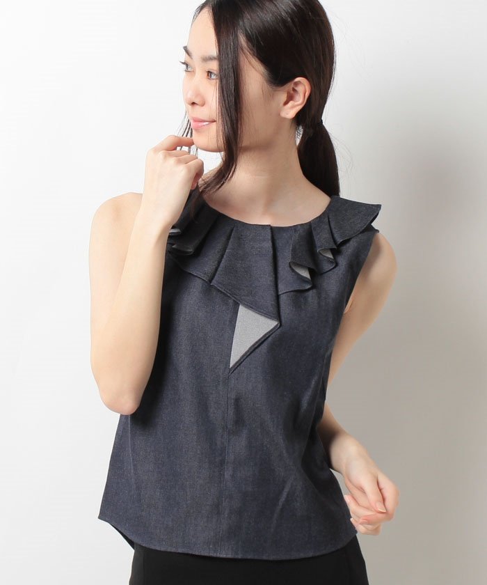 ネックラインに立体的な共布フリルをあしらったノースリーブのブラウス。デニムを使用しているのでフェミニンになり過ぎずカジュアルに仕上がります。長めに設定されたバックジップもアイキャッチー!