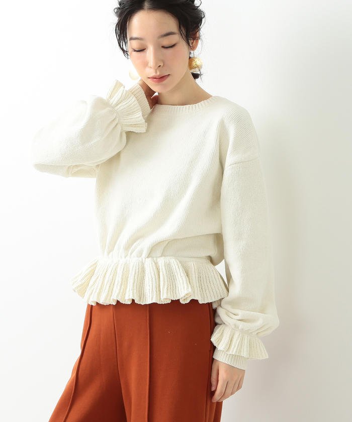 存在感溢れる裾と袖口のフリルがポイントのプルオーバー。こだわりのディテールがフェミニンな大人の女性を演出します。