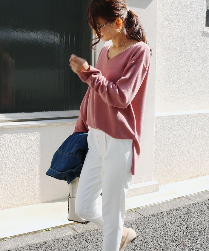 シンプルで楽ちん、そして美ラインが嬉しい! Vネック・ニットソーTOPが新登場です。 てろっとした落ち感のあるニットソー生地を使用、 そで・すそは切りっぱなし仕様でこなれ感のある ディテールに。ゆるやかなVネックが フェミニンな印象にみせてくれる1枚です。 柔らかな質感なので、そのまま着ても ウエストインしても大活躍!! スリット入り、後ろ丈が長めで ヒップまわりも体型カバーできる大人女子の味方。 アウターやベストなどのインとしても これからのシーズン着まわしやすいアイテムです♪♪ MODEL:身長162cm ※撮影時のライティング、ご覧になっているモニター・PC環境により 実際の商品と色味が異なって見える場合がございます。 ご了承の上お買い求め下さい。