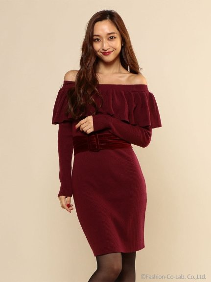 オフショルダーデザインがレディムードたっぷりのニットワンピース。胸元を飾るラッフルフリルも華やかなデザイン。ちょっとしたパーティシーンにも映えそうなアイテムです。