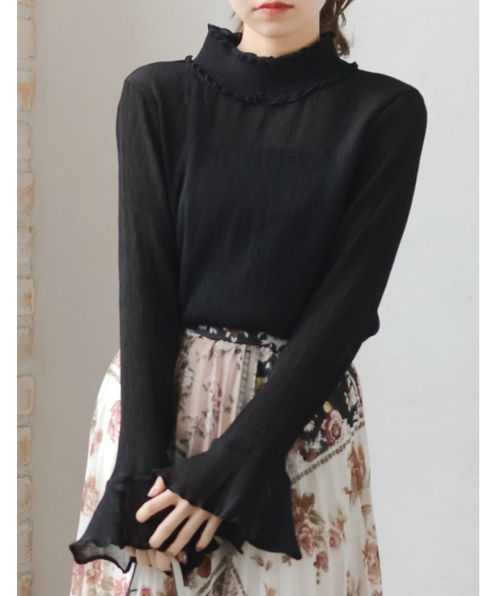 シフォン楊柳フリルハイネック袖フレアブラウス