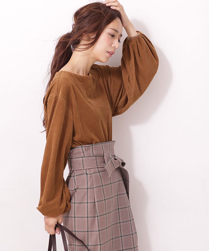 ベロア生地にチェックパターンを落とし込んだトップス。トレンドのベロア素材も、カブらず取り入れられて◎。いつものスタイリングも、合わせるだけで新鮮な印象にアップデートしてくれます。暖かみのあるベロアが季節感のある着こなしをアシスト。アイキャッチなボリュームスリーブもポイントです。
