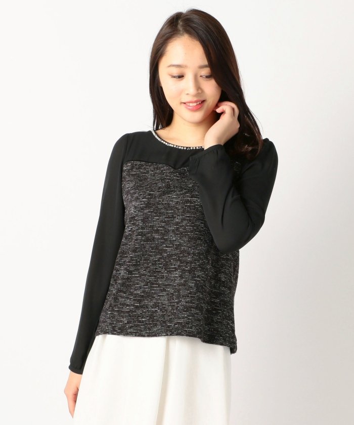 ハートモチーフのビスチェ風にツイードで切り替えた、異素材コンビのトップスです。同色でまとめてあるので、大人っぽく着られます。ドレスライクな雰囲気ただよう、衿まわりのパールビジューも華やかな1着です。