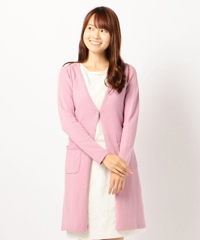 Vネックのロングカーディガンです。ビジューのような可愛いひとつボタンのすっきりとしたデザインで、様々なコーディネートに使えるのでデイリユースにぴったりです。ポケット付きなので、簡単な羽織としても重宝します。